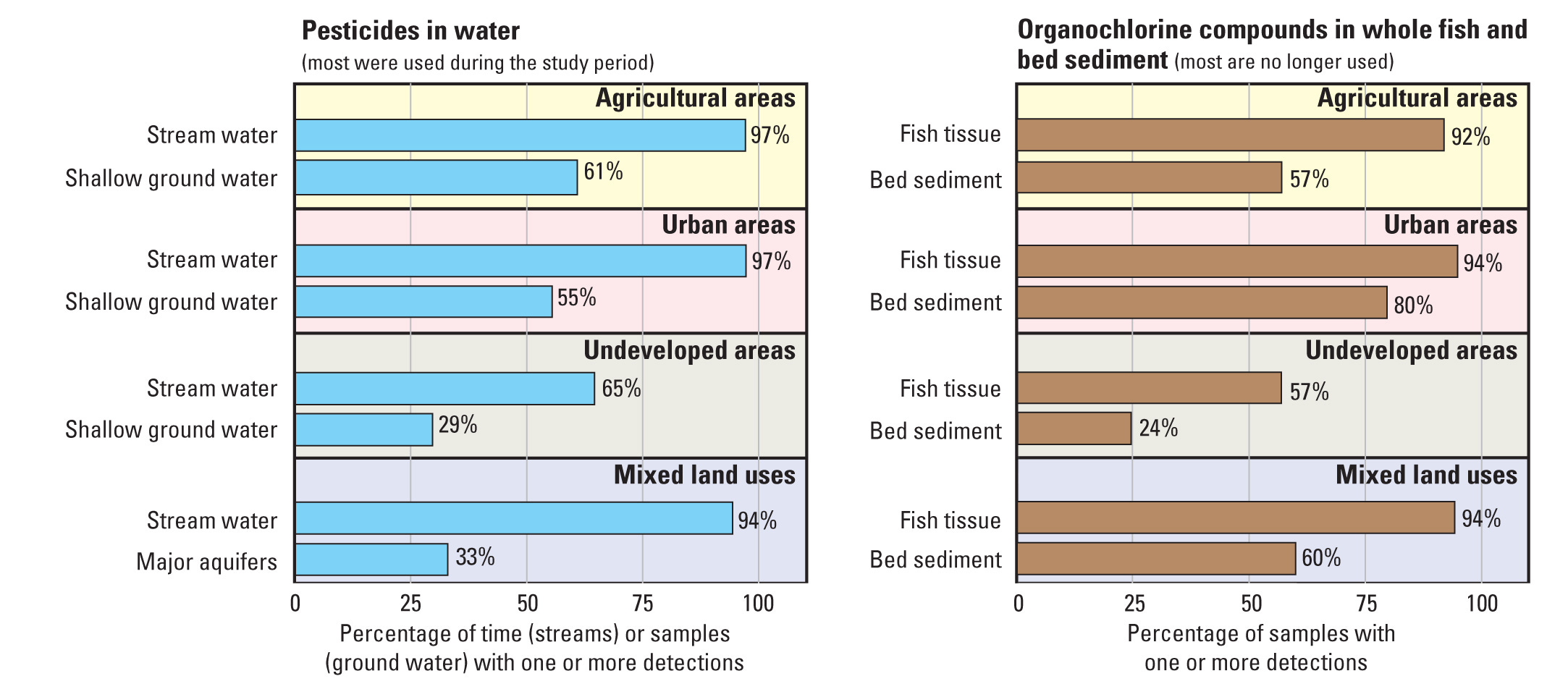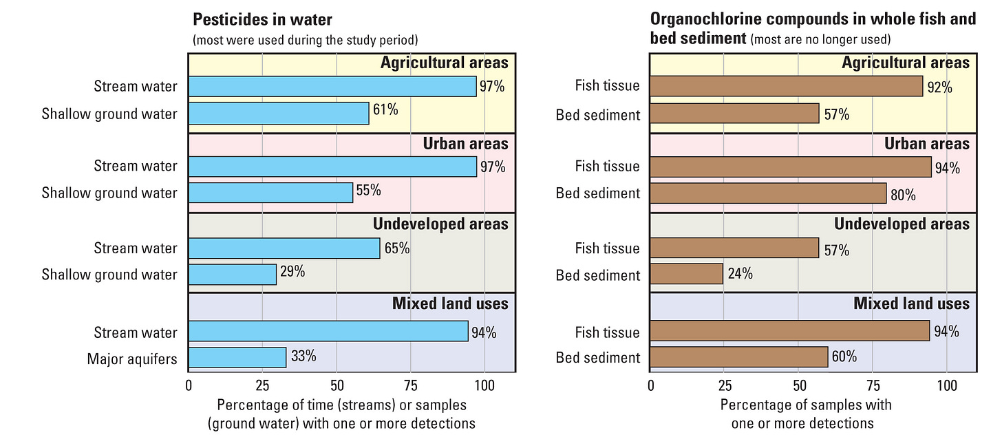 The US Geological Survey did extensive testing of our water supply for pesticides. They found at least one pesticide in all the streams tested. Organochlorine compounds (e.g., DDT—a banned pesticide) were found in most fish and bed sediment samples of rivers. In shallow groundwater, 50 percent of all samples were contaminated by pesticides. In deeper aquifers, about one-third of all samples were contaminated with at least one pesticide.