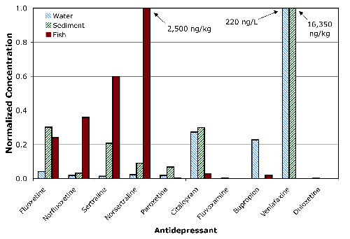 Antidepressants in water: Reprinted in part with permission from Schultz, M.M., Furlong, E.T., Kolpin, D.W., Werner, S.L., Schoenfuss, H.L., Barber, L.B., Blazer, V.S., Norris, D.O., and Vajda, A.M., Antidepressant pharmaceuticals in two U.S. effluent-impacted streams: occurrence and fate in water and sediment, and selective uptake in fish neural tissue. Copyright 2010 by Environmental Science and Technology, v. 44, no. 6, p. 1918–1925